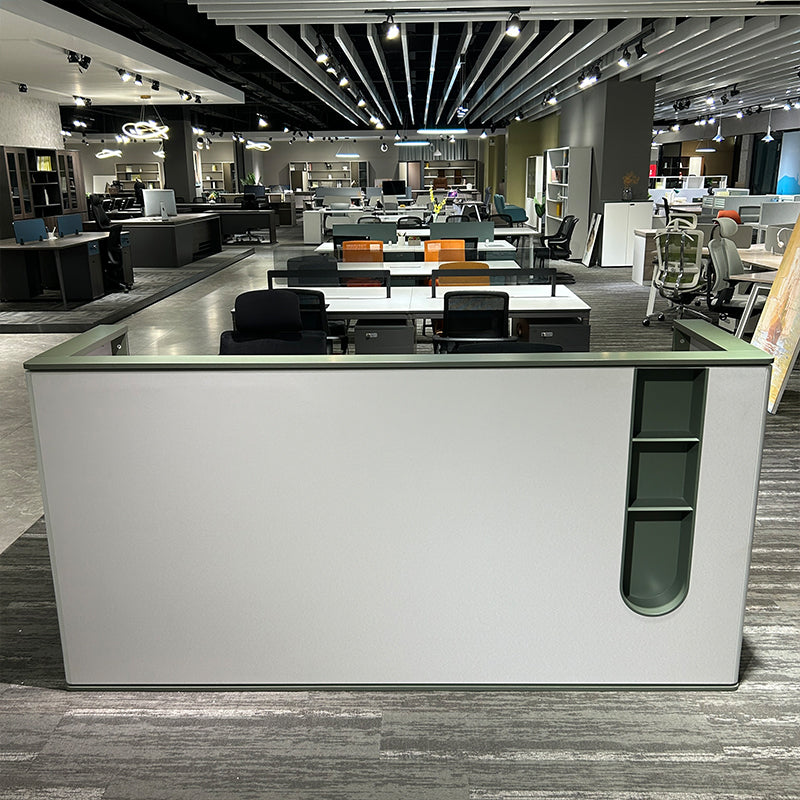 The desk features fashion-forward color combinations, smooth round edge banding, and a built-in decorative LED light strip—creating a welcoming and professional atmosphere for any business environment.